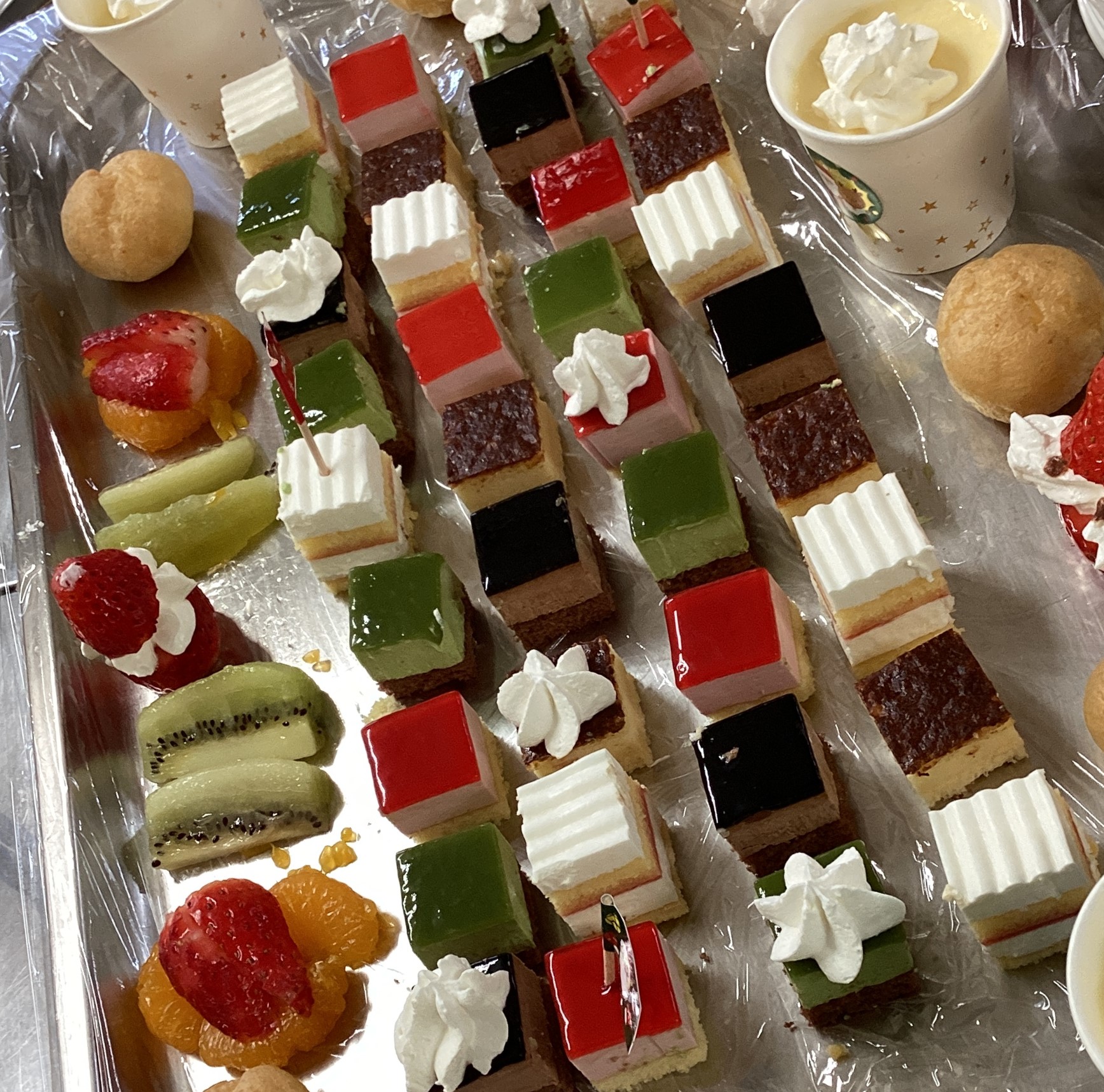 皆様楽しみにしておられた、ケーキバイキングを開催しました。サンタやトナカイに仮装した職員がケーキを配ります。