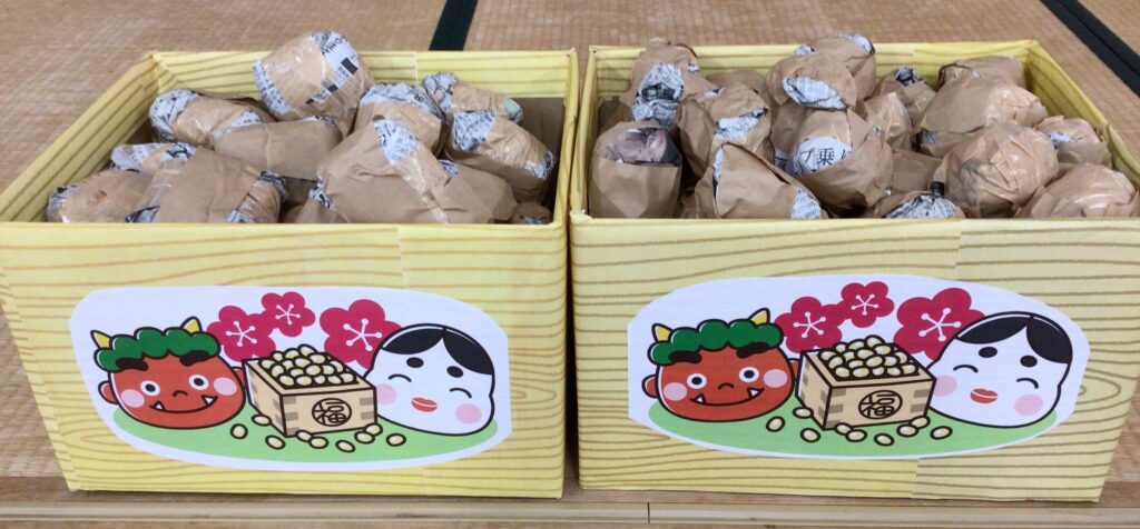 今年は安全に楽しめるよう、豆の代わりに新聞紙を丸めたボールを使いました。